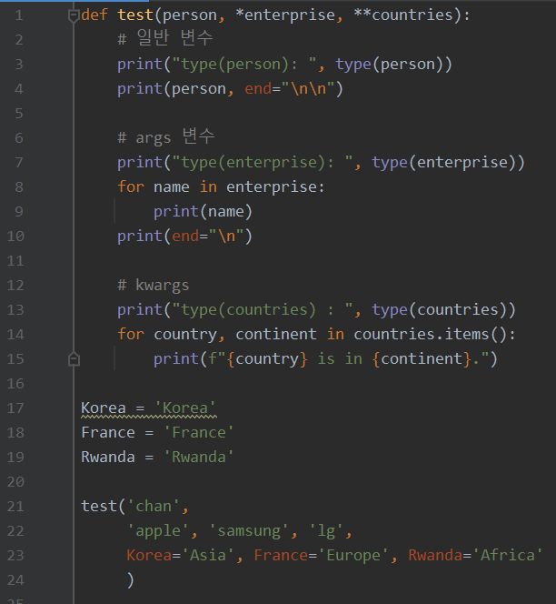 keyword arugments의 줄임말로 kwargs가 아닌 다른 문자열이 들어와도 된다.